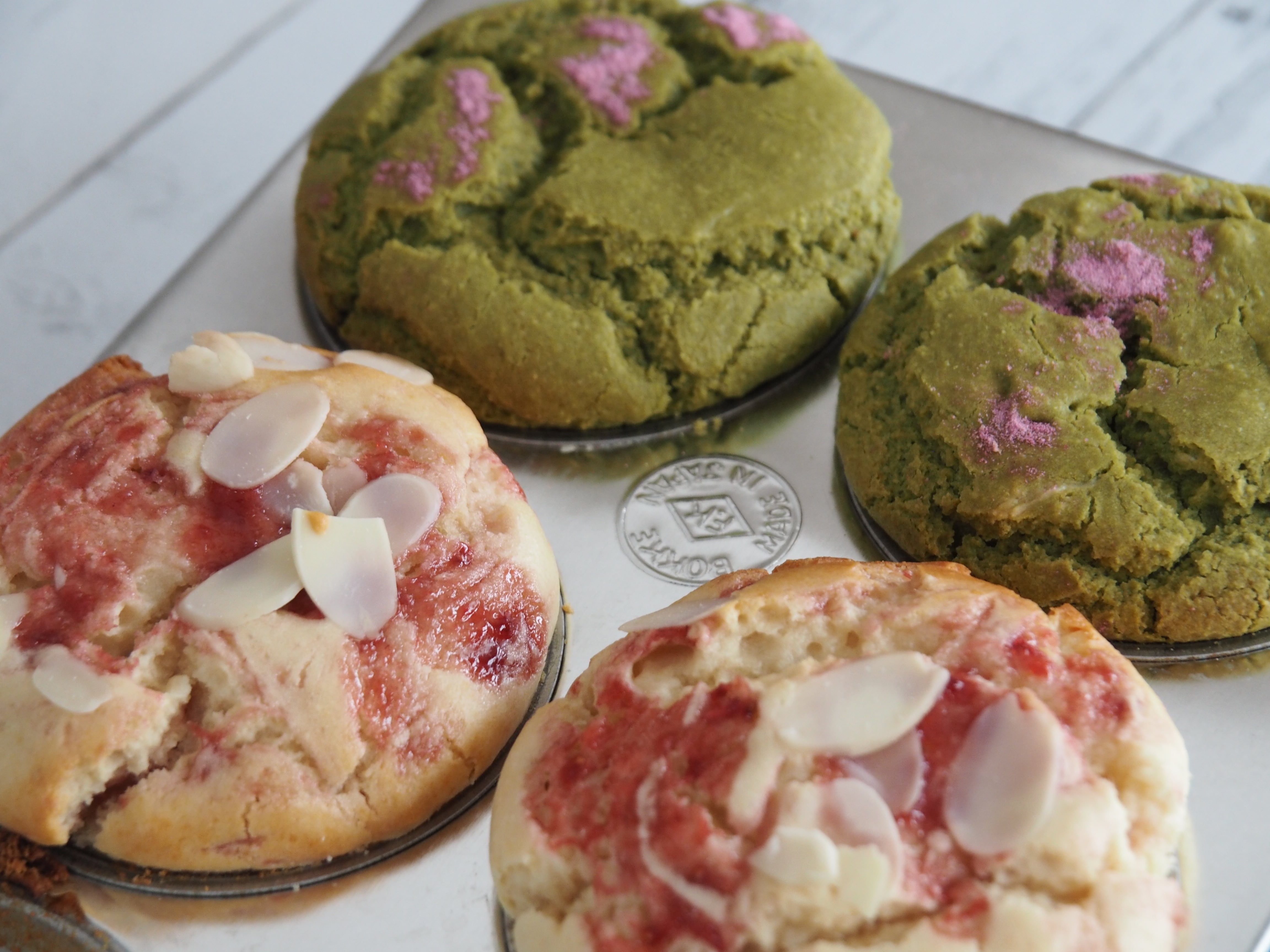 香り高い抹茶生地に、桜風味の求肥をしのばせました。ほろ苦さとやさしい甘さの重なり。